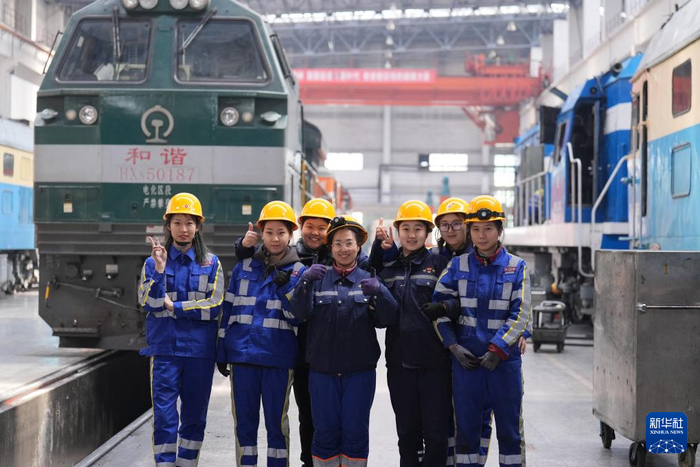 中国铁路哈尔滨局集团有限公司哈尔滨机务段女子检修班组机车钳工王嘉仪、王朝阳、赵佳琦、林增林、陈飞宇、杨建茹与李琳琳(从左至右)在检修库完成作业任务后合影(3月6日摄)。