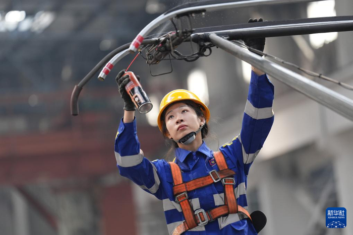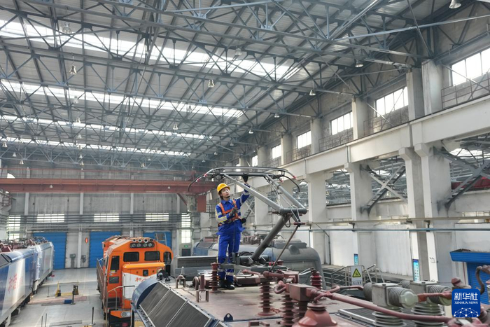 在中国铁路哈尔滨局集团有限公司哈尔滨机务段检修库内,机车钳工王嘉仪在对机车车顶受电弓进行升弓试验(3月6日摄)。