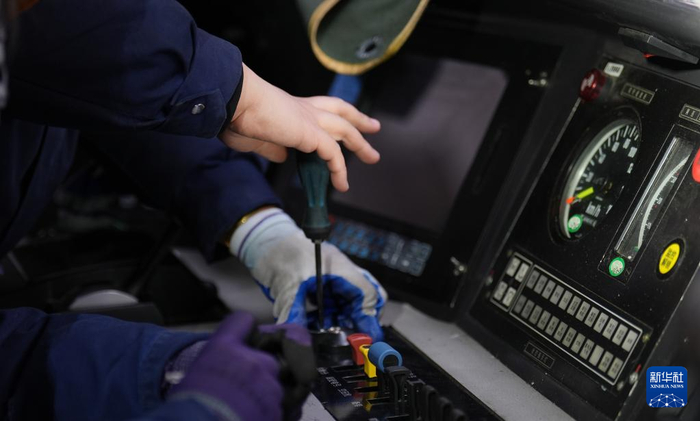 在中国铁路哈尔滨局集团有限公司哈尔滨机务段检修库内,机车钳工赵佳琦对机车司机室进行设备检修作业(3月6日摄)。