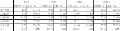 具体来看,2021年茅台租赁的投放行业中,酒产业链占比31.74%,绿色环保占比28.83%,基础设施占比17.47%。但到2024年一季度,酒产业链投放占比降至12.04%,绿色环保虽略有上升至32.10%,但基础设施领域的投放占比却大幅上升至37.52%,增加幅度达到20%。
