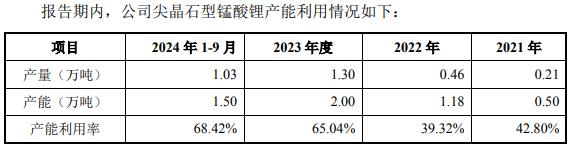 一是产能消化风险。2022年末,公司锰酸锂产能达2万吨/年,扩产后2026年将达5万吨/年,但2021年—2023年及2024年上半年,公司尖晶石型锰酸锂的产能利用率分别为42.80%、39.32%、65.04%、68.42%,存在项目扩产与产能利用率不足的矛盾。另外,锰酸锂行业内其他企业如博石高科、贵州百思特等企业也存在产能扩张计划,新增产能可能面临市场饱和压力,进一步加剧供需失衡。