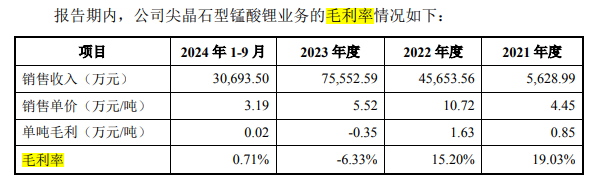 二是产品盈利波动大。锰酸锂业务受原材料碳酸锂价格波动影响显著。报告期内,碳酸锂等直接材料成本占锰酸锂的营业成本的比重分别为91.05%、94.76%、93.87%和89.55%,原材料价格波动对公司成本有较大的影响。2021年—2023年及2024年1月至9月,公司尖晶石型锰酸锂毛利率分别为19.03%、15.20%、-6.33%、0.71%,波动相对剧烈。从中可以看出,公司尖晶石型锰酸锂毛利率2021年~2022年还高达两位数以上,但到2023年即急剧转负(-6.33%),2024年虽短暂回升至0.71%,但行业竞争加剧及原材料价格不稳定仍威胁盈利。