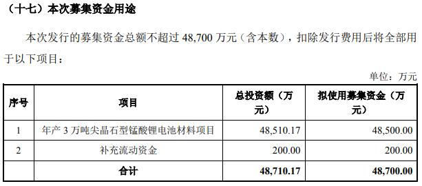 据公司此前公告,湘潭电化本次可转债拟募集资金总规模不超过4.87亿元,其中4.85亿元投向年产3万吨尖晶石型锰酸锂电池材料项目,200万元用于补充流动资金。