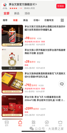 在京东平台的茅台文旅官方旗舰店,销量较高的产品有文创茶叶罐礼盒、文创酒开瓶器、分酒器,以及200ml规格的蛇年文创礼盒飞天茅台。此外,店铺还推出了柿柿如意套盒、中秋团圆季套盒、端午安康季套盒等文创礼盒茅台酒产品。