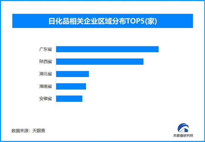 天眼查专业版数据显示,截至目前我国现存在业、存续状态的日化品(化妆、护肤等)相关企业超35.2万家。其中,2024年新增注册相关企业超2000家。从区域分布来看,广东省、陕西省日化品相关企业数量位居前列,两个省市数量总和超过13.8万余家,占企业总数的39.4%。排在其后的是湖北省、湖南省和安徽省。