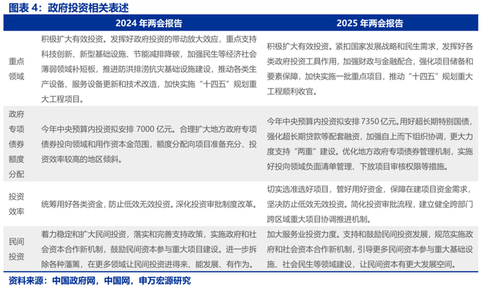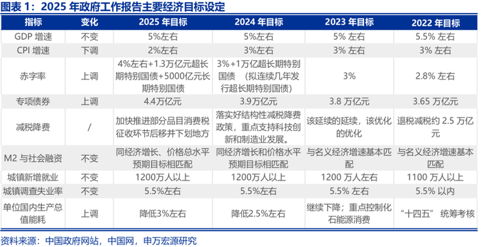 主要经济目标设定更加“务实”,对相关指标设计讨论充分。2025年经济增长预期目标为5%左右,与2024年持平。经济目标增速设定持平的背后“既是稳就业、防风险、惠民生的需要,也有经济增长潜力和有利条件支撑,并与中长期发展目标相衔接”。同时,报告也提出“实现这些目标很不容易,必须付出艰苦努力”。基于5%左右的经济增长目标,政策部署更加灵活,报告指出将“根据形势变化动态调整政策,提高宏观调控的前瞻性、针对性、有效性”,执行层面注重“加强上下联动、横向协作”,“注重倾听市场声音”。