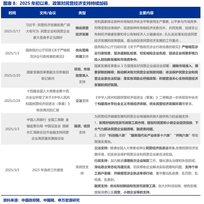 政策高度重视民营经济在创新驱动、消费提振、就业促进等方面的积极效能。2025年初以来,政策对民营经济支持即持续加码。2月下旬民营经济座谈会后,多部委发文、表态,从优化营商环境,放宽市场准入,加大融资支持力度等方面支持民营经济发展。本次政府工作报告再度从多方面呵护民营经济,提出“促进平台经济规范健康发展,更好发挥其在促创新、扩消费、稳就业等方面的积极作用”。同时,报告亦提及提请全国人大常委会审议民营经济促进法草案,加力推进清理拖欠企业账款工作,深化政企常态化沟通交流,开展规范涉企执法专项行动,加大对民营、小微企业金融支持等方面。