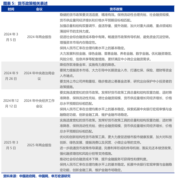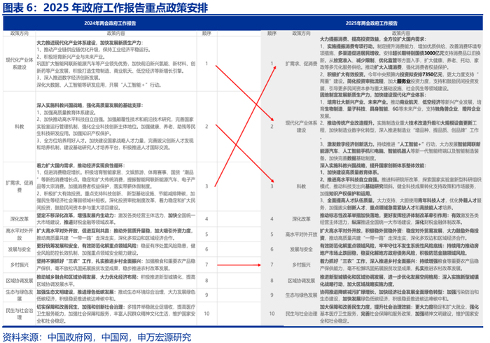 “打好政策组合拳”,更加注重目标引领,提升实施效能。2025政策基调延续2024年中央经济工作会议基调,强调“系统集成、协同配合,充实完善政策工具箱,根据形势变化动态调整政策,提高宏观调控的前瞻性、针对性、有效性“。在此基础上,报告新增提出“提升政策目标、工具、时机、力度、节奏的匹配度”,“强化宏观政策民生导向”。