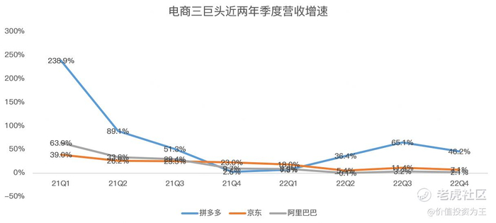 具体来看,拼多多Q4营收398.2亿人民币,同比大增46.2%,远高于阿里巴巴的2.1%和京东7.1%的增速:
