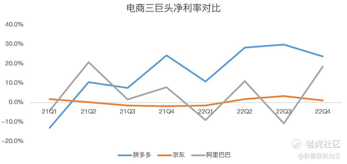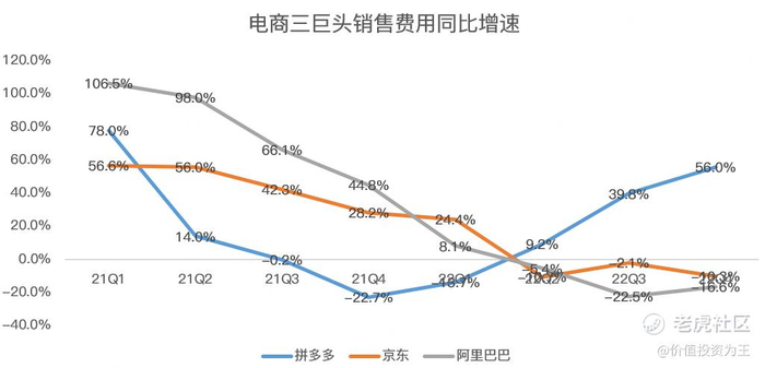除了净利率绝对数上的超越,盈利质量上拼多多也更胜一筹,众所周知,互联网公司在2022年业绩不佳之后开启疯狂裁员和节省开支模式,反应到财务数据上,如销售费用,京东和阿里巴巴四季度同比增速分别为-10.3%和-16.6%,而拼多多四季度营销费用同比大增56%:
