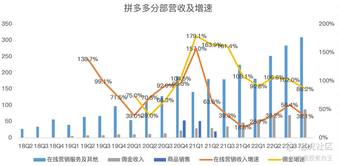 拼多多在21年末和22年初有过低增长,但主要是自营商品业务波动带来,核心主业仍保持了高速增长: