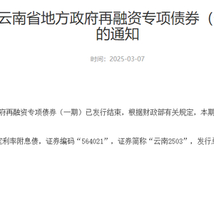 2025年云南省地方政府再融资专项债券(一期)将于3月11日在深交所上市交易。