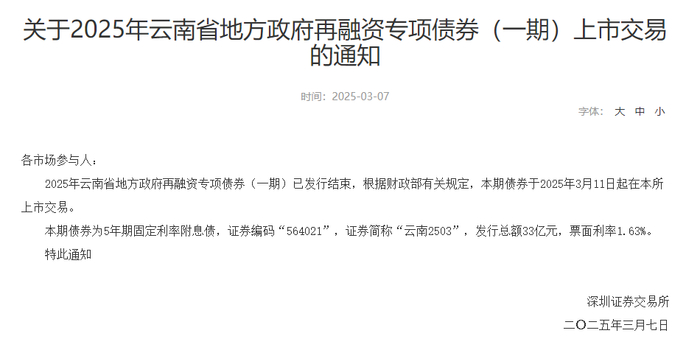 3月7日,深圳证券交易所宣布,2025年云南省地方政府再融资专项债券(一期)已成功发行,并将于3月11日起在该所上市交易。本期债券为5年期固定利率附息债,证券编码为“564021”,简称“云南2503”,发行总额达到33亿元人民币,票面利率为1.63%。