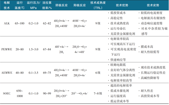 图1为未来典型氢经济产业链示意,在推动氢能大规模应用的进程中,关键材料的研发与氢能转化效率的提升至关重要。而开发稳定高效的氢-电/电-氢转换催化剂,发展安全、可靠、高效的氢储运新型材料与技术是实现氢能技术高质量发展的核心。在催化剂方面,研发更高效、稳定且低成本的材料能够提高氢能生产与利用效率并保持其经济性。在氢储运装置材料上,需寻找具备良好安全性、耐用性和轻量化的材料,以确保氢气的安全、高效存储与运输。对于储氢材料,则需开发具有更优氢气吸附/释放性能和更长使用寿命的创新型材料,以满足多种应用场景的灵活需求。在氢能应用端,2024年,氢燃料电池汽车需求迅速增长,特别是在物流车、公交车和重型卡车领域。随着技术进步,氢能车企的生产能力和市场渗透率将持续提升。同时,绿氢在钢铁、电力和化工等高排放行业的应用不断增加,部分钢铁企业已开始用绿氢替代化石燃料,推动工业脱碳。1、电解制氢技术在全球低碳能源转型及“双碳”目标的推动下,2024年电解制氢技术取得了显著的发展。主要集中在提升电解效率、降低电堆成本和开发先进材料上。碱性电解水(AWE)因其技术成熟度高、成本较低等特性,在可再生能源制氢系统中进一步推广。此外,其性能也随着电极材料的改进而提高。质子交换膜电解(PEM)则因其高效率和快速响应的特点备受关注,研究重点在于减少贵金属催化剂使用以降低成本,并提升膜材料的耐用性。固体氧化物电解(SOE)技术因具有较高的电解效率(90%),且能与高温、工业余热等多种应用场景灵活集成,具有良好的发展潜力,但其目前成本较高且长期运行材料稳定性较差。2024年,绿氢(由可再生能源,如风能、太阳能电力驱动的电解水制氢)成为电解制氢领域的热点。中国西北地区(内蒙古自治区、新疆维吾尔自治区、甘肃省等)凭借丰富的风能和光伏资源,成为绿氢项目的主要聚集地,形成了多个大型示范项目。目前,主流的电解制氢技术有碱性电解水技术(ALK)、质子交换膜电解技术(PEMWE)、阴离子交换膜电解技术(AEMWE)及固体氧化物电解技术(SOEC),上述4种电解技术的工作原理、运行特性以及优劣势总结如表1所示。