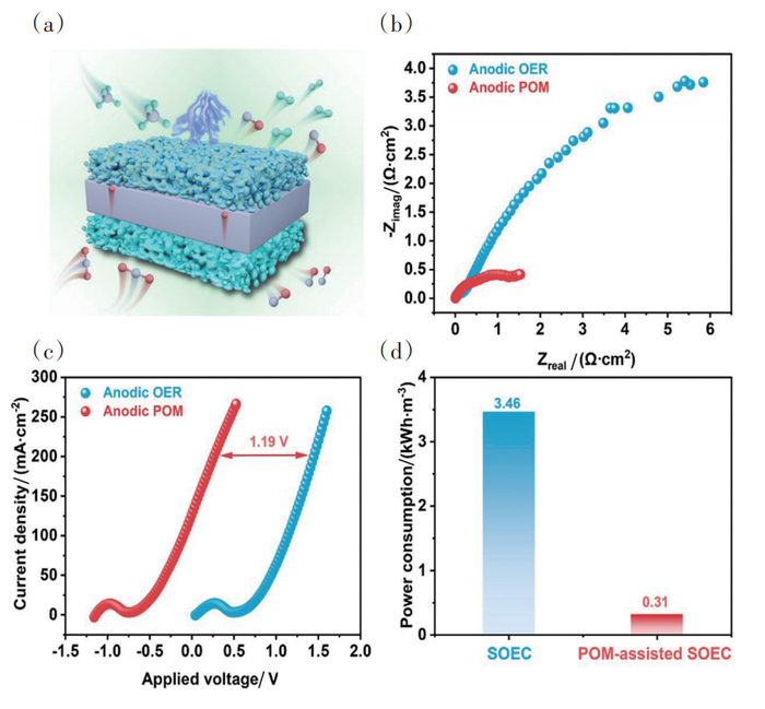 国外SOEC电解槽的发展一直处于领先状态。目前,国外领先SOEC企业的电堆可以利用电和热来制氢,将88.5%的低热值转化为直流电。生产1 kg氢气耗电37.7 kWh,在与外部热源集成时,比低温PEM和ALK电堆的用电量少30%。此外,国外该领域的代表企业目前已实现SOEC电堆的单电池衰减速率≤1%/1000 h。与国外相比,国内产业化进程较落后于国外,相比碱性和PEM技术,SOEC仍处于研发示范阶段。在技术研发方面,中国科学院大连化学物理研究所包信和院士团队于2024年7月在Joule上报告了固体氧化物电解器(SOEC)阳极甲烷重整催化剂设计方面取得的新进展,采用原位溶出技术构建金属/氧化物活性界面,开发出高效且稳定的电化学重整催化剂,并结合多种原位物理化学表征手段,揭示了SOEC阳极上甲烷重整的反应机理。通过调控La0.6Sr0.4Ti0.3Fe0.7-xCoxO3-δ(LSTFC2)阳极钙钛矿中B位Co/Fe比例,优化过渡金属溶出能,实现在表面原位生成平均粒径7 nm、密度1087个·μm-2的CoFe合金纳米颗粒,提供了丰富的活性位点以促进阳极CH4转化。同时,电驱动产生的溢流氧进一步促进甲烷的吸附与活化,并有效抑制积碳,从而提升催化剂的活性和稳定性。在800°C下,LSTFC2阳极的CH4转化率达86.9%,CO选择性达90.1%,可连续稳定运行1250 h无显著衰减。电化学测试显示,引入甲烷部分氧化重整后,CO生产能耗从传统SOEC的3.46 kWh·m-3降至0.31 kWh·m-3,所开发的SOEC电化学性能如图5所示。