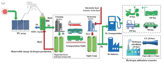 图 13 基于光伏发电-固体氧化物电解-镁氢化物基氢气储运氢(PV-SOEC-MgH2)的典型绿色氢气生产、储存、运输和利用路线(a)及PV-SOEC-MgH2中的热集成结构(b)