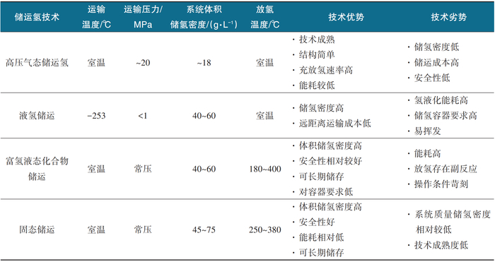 图5 SOEC电化学性能:(a)部分氧化重整(The partial oxidation of methane,POM)辅助SOEC的示意;(b)在开路电压(OCV)下阳极OER和阳极POM的电化学阻抗谱(EIS);(c)阳极OER和阳极POM的电流-电压(J-V)曲线;(d)传统SOEC与POM辅助SOEC在800°C下的耗电量2、新型储运氢技术储运氢技术是制约中国氢能和燃料电池产业发展的关键技术瓶颈。由于氢气特殊的物理化学特性,使其难以储存且存在较大安全性挑战,同时储运氢成本较高,约占氢能产业链总成本的30%~40%。而新型氢储运技术的推广将为能源转型和二氧化碳减排作出巨大贡献,并为能源行业带来重大变革机遇。随着新型氢储运技术的不断突破,储氢效率和储氢可靠性将显著提升。同时,新型储氢材料的研发也提高了储氢容量和充放氢速率,从而提升了储氢灵活性及储氢效率,刺激了氢能产业的加速成长。表2对比了多种新型氢储运技术和传统储氢技术的技术特点及其优劣。