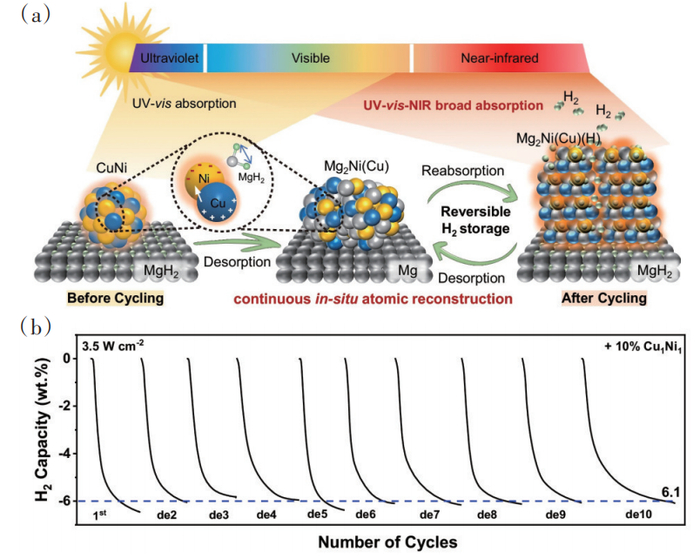 在固态储氢材料方面,目前的研究聚焦于材料改性以延长循环寿命、提升储氢能量效率及吸/放氢速率。复旦大学余学斌教授团队于2024年4月在Nature Communications报道了MgH2与CuNi合金技术,实现稳定的太阳能驱动可逆储氢。研究结果表明,Mg2Ni(Cu)的可逆生成有效结合了光热效应和催化效应,使局部热量直接作用于催化位点而无热损失。在35000 W·m-2辐照强度下,MgH2在15 min内完全脱氢。此外,Mg2Ni(Cu)在循环脱氢和吸氢过程中保持了良好的稳定性,可逆储氢容量达6.1wt%,容量保持率为95%。图6(a)为高效的光热-催化太阳能驱动的原位可逆储氢示意,图6(b)为光强为35000 W·m-2时Cu1Ni1催化下MgH2循环H2脱附曲线。材料通过吸收光能产生热效应,进而加速氢气的吸附与脱附过程,光热效应与催化效应的协同作用显著提升了材料的储氢效率和循环稳定性。