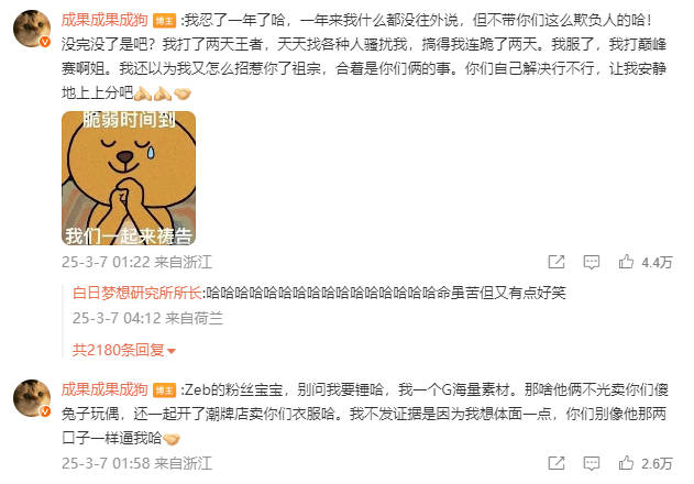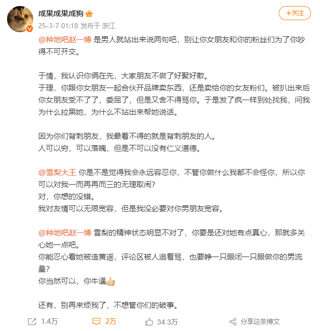今(7日)天凌晨,@成果成果成狗在社交媒体公开喊话当红偶像赵一博:“是男人就站出来说两句吧,别让你女朋友和你的粉丝为了你吵得不可开交。” 怒斥其隐瞒与网红雪梨大王的恋情,并控诉两人利用情侣身份经营潮牌店收割粉丝。