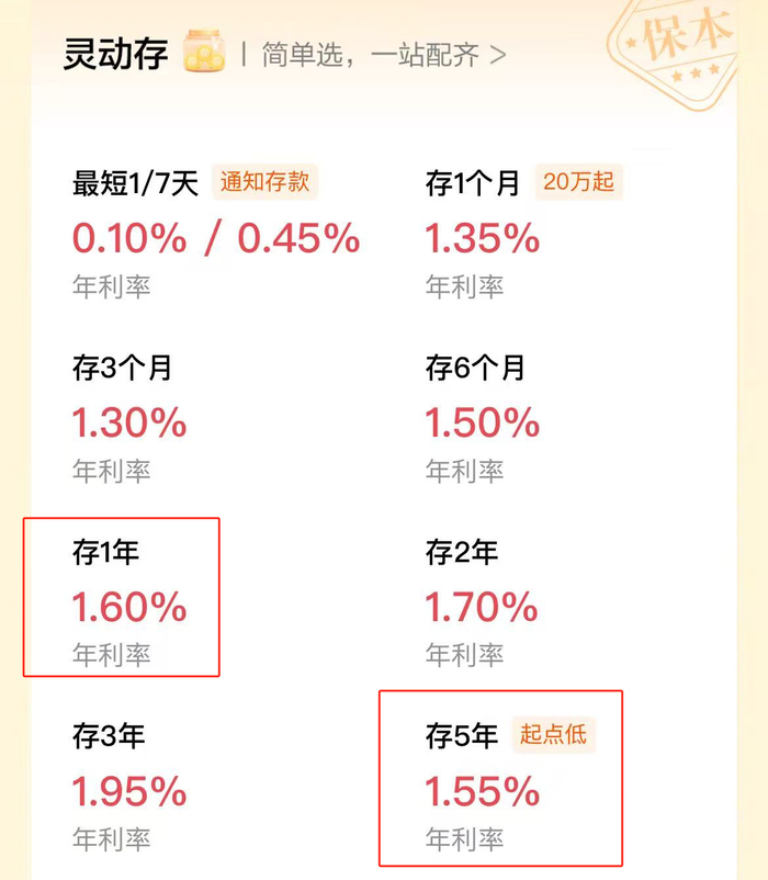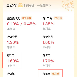 据了解,在“灵动存”中,1年期存款产品分为两种,一种是“享定存”特色存款产品,1000元起存,年利率1.6%,到期本息自动入账,另一种是“整存整取”存款产品,50元起存,年利率1.1%,可选到期转存;5年期存款产品为“整存整取”存款产品,50元起存,年利率1.55%,可选到期转存。