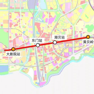 地铁5号线西延起自目前5号线终点站黄贝岭站,终至大剧院站,线路全长2.88km。线路共设3座车站:湖贝站、东门站、大剧院站。其中,大剧院站可与地铁1号线、2号线换乘。
