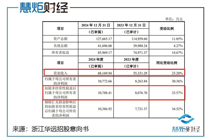 在招股意向书中,浙江华远披露了最新业绩情况,2024年,其实现营业收入6.82亿元,同比增长了23.20%,创下了自2022年以来增速最高值;当期实现扣非净利润1.08亿元首次突破亿元大关,同比增长了33.57%远高于2023年增速的14.62%。
