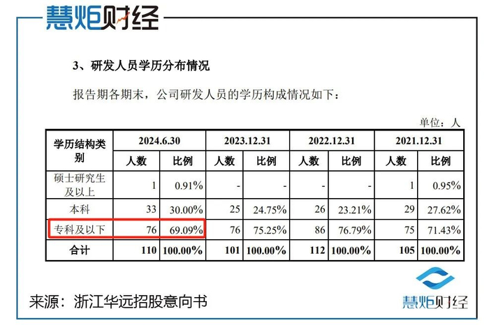 招股书显示,截至2024年6月底,浙江华远共有研发人员110人,但其中具备硕士研究生及以上学历者只有1人,占研发人员总数仅0.91%,本科学历者只有33人,占比仅30%,其余皆为大专及以下学历,占研发人员总数的69.09%。