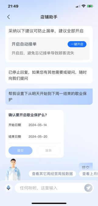 在大部分场景内,商家可以通过对话快速与AI助手定位相关问题,并有记忆和联想功能。遇到需要解决的具体场景问题,可以通过AI助手快速获得答案、还可以一键直接进行经营作业,例如设置一段周期内的歇业保护。