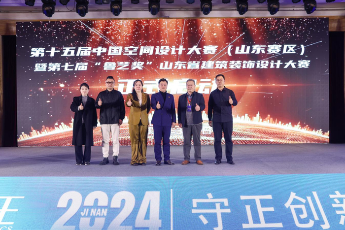 中国国际空间设计大赛(中国建筑装饰设计奖)运营总监毕知语、家装下午茶创始人兼总裁/上海市室内装饰行业协会住宅委全国调研处主任/家装下午茶创始人兼总裁许春阳、马蹄莲空间设计创始人&设计总监/南京传媒学院副教授陈熠、山东省装饰协会名誉会长申广勇、中国建筑学会室内设计分会理事/山东工艺美术学院副教授/山东省装饰协会轮值会长栾滨、中国空间设计大赛(山东赛区)组委会负责人黄金芝共同启动《第十五届中国空间设计大赛(山东赛区)暨第七届“鲁艺奖”山东省建筑装饰设计大赛》。
