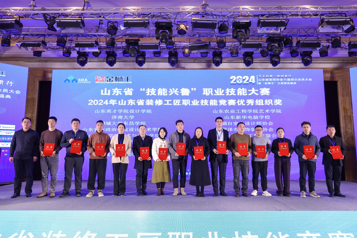 山东省轻工集体企业联社发展规划部副处长/山东省装饰协会党支部书记李会勇、山东省装饰协会国有资产监事/党支部副书记杨永军、中国建筑学会室内设计分会理事/山东工艺美术学院副教授/山东省装饰协会轮值会长栾滨分别为山东省“技能兴鲁”职业技能大赛2024年山东省装修工匠职业技能竞赛优秀组织奖颁发证书。