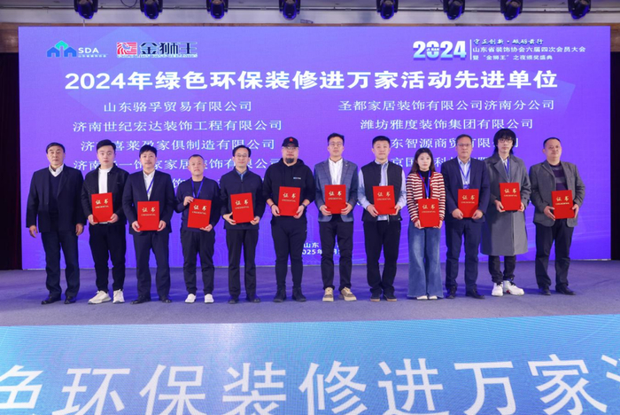 山东省商务厅市场运行和消费促进处二级调研员王春报、济南市商务局副局级干部/济南市商务促进中心党总支书记张洪恩、山东省消费者协会宣传委员马飞分别为2024年绿色环保装修进万家活动先进单位颁发证书。