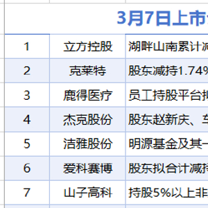 3月7日,据统计,截至发稿前,包括立方控股、克莱特、鹿得医疗、杰克股份、洁雅股份、爱科赛博、山子高科等7家上市公司披露减持情况。当日,暂无上市公司披露增持情况。