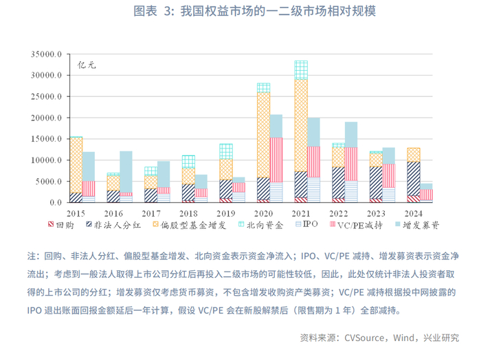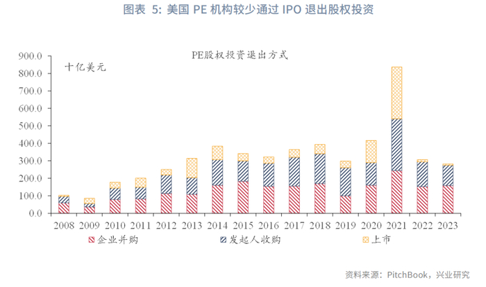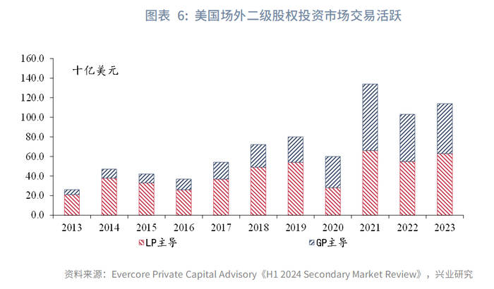 从美国资本市场的情况来看,私募股权投资机构所投股权主要通过彼此之间转让或者公司并购实现退出,对IPO的依赖度较轻。根据PitchBook统计,2019-2023年,美国一级市场PE机构股权投资退出总规模为21400亿美元,其中IPO为4807亿美元,占比为22.46%,公司并购和发起人收购占比分别为38.04%、39.50%。根据Evercore Private Advisory统计,2019-2023年,美国二级股权市场交易总规模为4910亿美元,与IPO基本持平。其中,自2021年以来,年交易规模为585亿美元,中枢较之前(2018-2020年年均交易规模为353亿美元)显著抬升。
