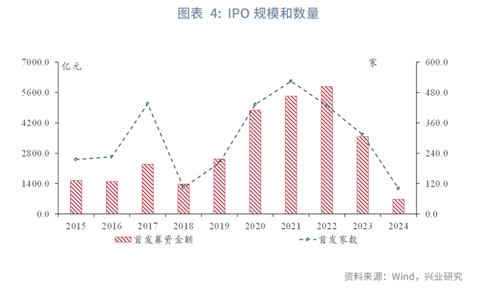 根据投中网统计,2024年国内私募股权和风险投资(VC/PE)市场募资活跃度较低,新设基金数量和认缴规模同比分别下降41.9%、43.3%,完成募集基金数量和募集规模同比分别减少8.1%、减少46.9%。