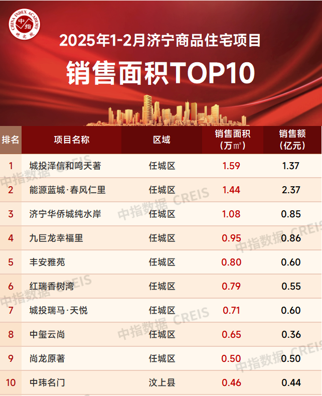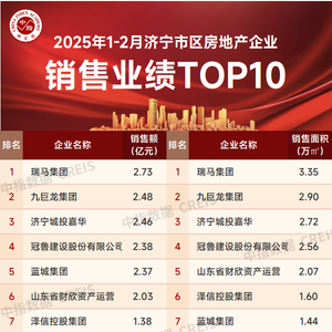 特别声明:房地产企业销售数据统计是以2025年1-2月销售的商品住宅为统计口径,主要依据中指研究院在济宁市市区(不包括县、市)的销售监测数据,并同时参考企业提供的相关数据,对少数没有在监测范围内的项目,由企业提供相关文件,经审核,也纳入统计范围,集中网签的已售罄项目不纳入榜单。本榜单仅供参考,课题组不对使用榜单及其内容所引发的任何直接或间接损失承担责任。