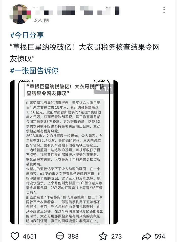 朱子文纳税破亿消息在网上流传开来