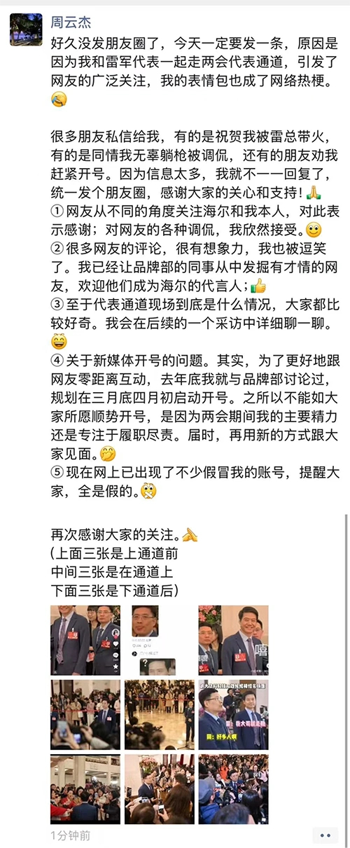 3月7日,全国人大代表、海尔集团董事局主席兼首席执行官周云杰在朋友圈对此事作出回应。