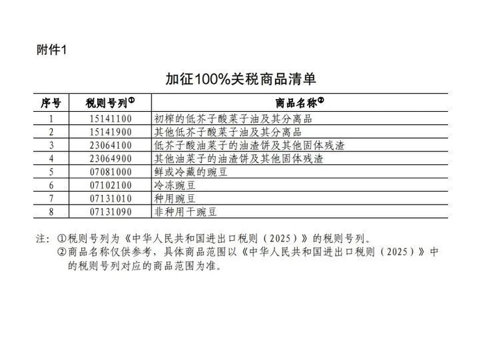 一、对菜子油、油渣饼、豌豆加征100%关税,具体商品范围见附件1。
