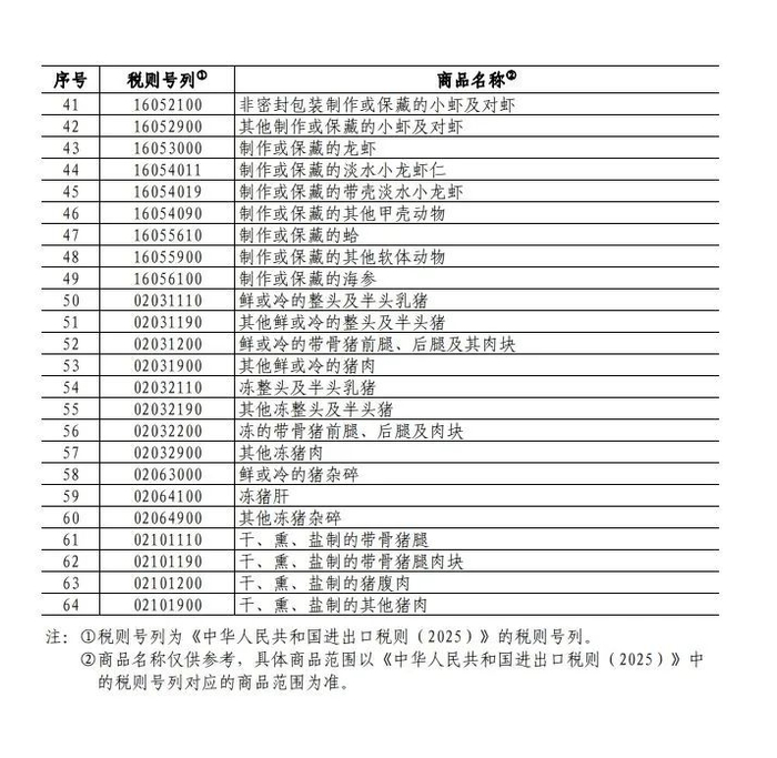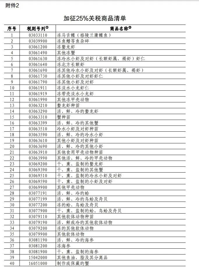 二、对水产品、猪肉加征25%关税,具体商品范围见附件2。