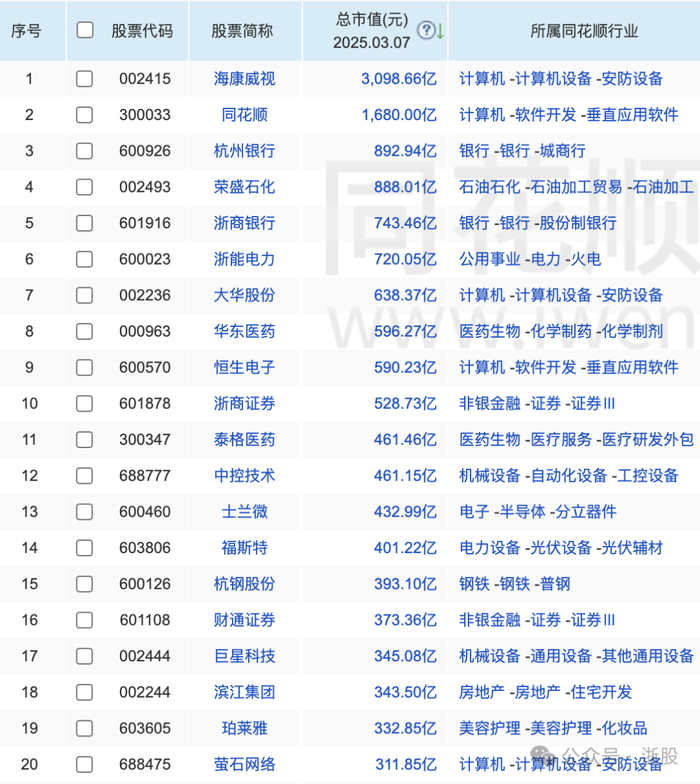 杭州现有千亿市值公司两家,分别为滨江区的海康威视、余杭区的同花顺。市值超百亿公司67家,其中20家超300亿。