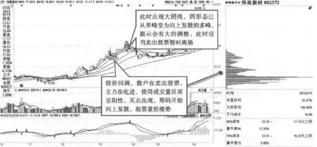 大阴线突然出现在上涨途中的单峰密集区,此时经过上涨,下方积累了一定的获得筹码,有兑现获利的需求,主力便借机洗盘,股价下挫,上涨行情受阻。但单峰密集形态未改变,说明后市仍会上涨,只不过是略事休整,主力借机吸到更多的低价筹码。比如,伟星新材