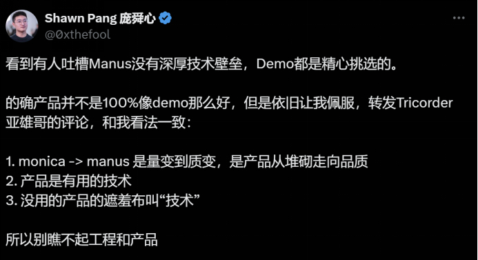 但哈希增长(HashMatrix)的联合创始人庞舜心并不认可“Manus没有深厚技术壁垒”这一说法。他认为,产品虽不是100%像demo那么好,但依旧让他佩服。“从monica到manus是量变到质变,是产品从堆砌走向品质。产品是有用的技术。”