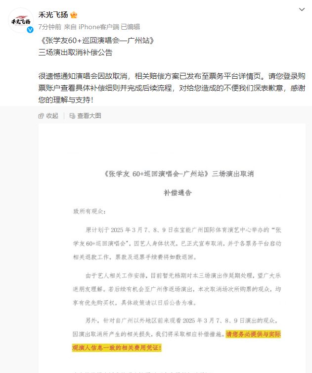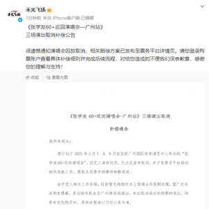 3月7日,张学友演唱会方发布声明,称张学友本周广州演唱会因身体原因取消。3月8日,《张学友60+巡回演唱会—广州站》发布三场演出取消补偿公告,详情如下: