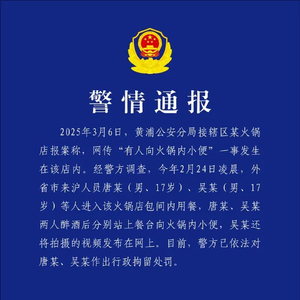 2025年3月6日,黄浦公安分局接辖区某火锅店报案称,网传“有人向火锅内小便”一事发生在该店内。经警方调查,今年2月24日凌晨,外省市来沪人员唐某(男、17岁)、吴某(男、17岁)等人进入该火锅店包间内用餐,唐某、吴某两人醉酒后分别站上餐台向火锅内小便,吴某还将拍摄的视频发布在网上。目前,警方已依法对唐某、吴某作出行政拘留处罚。