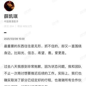 薛凯琪在长文中提到,过去八天因状态问题,自己与团队商讨取消了部分已经确定好的行程,并表示,一直以来都希望将最快乐的自己展现给所有人,过去的几天没有发声是不想影响大家,也因为“根本没有照片和任何写出来的话,能够表达我的悲伤以及让我和大家释怀”。