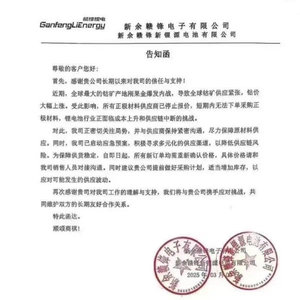 3月5日,新余赣锋电子有限公司(下称“赣锋电子”)发出的一封客户告知函在网上流传开来,提及“因为钴价大涨,所有正极材料供应商停止报价,短期内无法下单采购,即日起所有新订单均需重新确认价格。”《华夏时报》记者为此联系了赣锋锂业(002460.SZ),对方对此事未予回复。