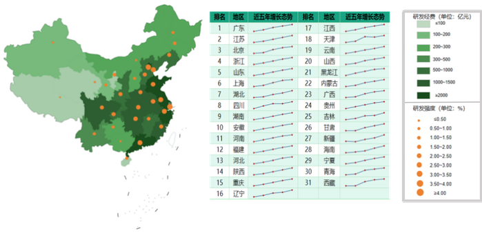 图5 中国省级行政区研发经费投入规模及强度(2023年)