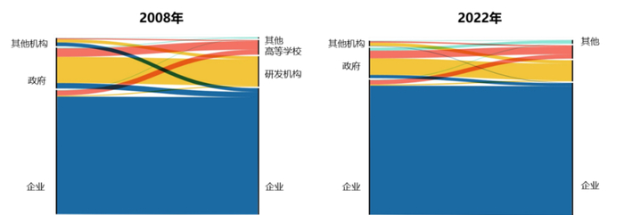 2008~2022年,政府对研发机构的经费投入占比从64.26%减少至2020年的59.01%,在2022年持续降低至54.77%;对高等学校的经费投入占比从20.71%增长至2020年的23.38%,并在2022年持续增长至25.30%;对企业的投入占比从13.36%降至2020年的10.89%,在2022年小幅下降至10.47%。总体而言,企业研发经费基本用于本部门研发活动,政府资金以支持研发机构和高校为主。近年来,政府对研发机构的经费支持力度降低,对高等学校的支持力度提升。