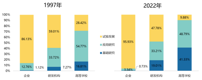 图9 中国研发经费执行主体的研发类型结构(1997-2022年)
