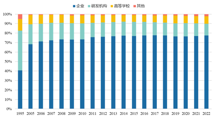 在研发经费的执行主体方面,企业、大学和科研机构承担了主要任务。1995~2022年,企业执行研发经费比例由40.64%增长至2020年的76.55%,2022年进一步提升至77.57%。科研机构执行经费比例从41.98%下降至2020年的13.97%,2022年进一步降至12.39%;高等学校执行经费比例由12.13%缩减至2020年的7.72%,2022年略有回升至7.84%。总体而言,我国研发经费的执行结构已从“企业与科研机构双主体”逐步演变为“企业主导”,科研机构和高等学校在研发创新体系中的位置相对下降。